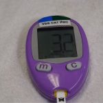 La gota de sangre se coloca en una tira reactiva que se inserta en el glucómetro. La tira reactiva contiene una sustancia química que reacciona con la glucosa en la sangre y produce una lectura de los niveles de glucosa.